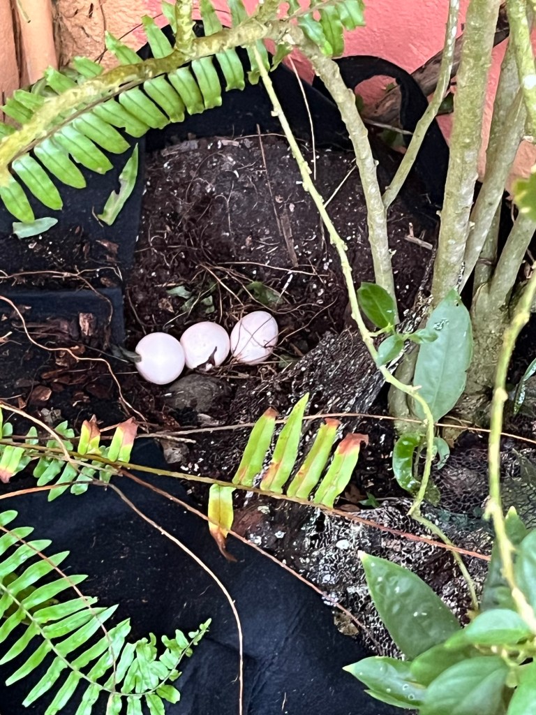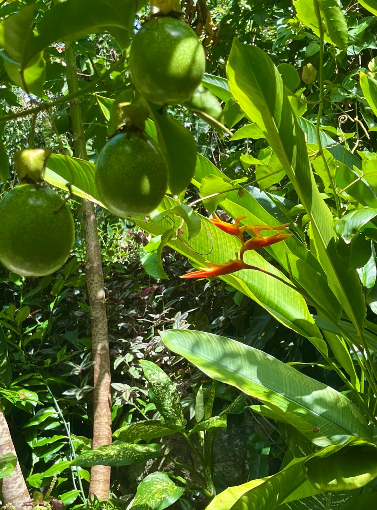 All that rain has caused quite a crop of gold passion fruit growing on a net suspended over what I call my tiny jungle garden – I have truly counted more than 100 of them. My bird of paradise plants tower over me & stand next to a pair of papaya trees, spiraling ginger and a very happy baby moringa tree. My night-blooming jasmine is indeed blooming. Underneath those blooms, a wild jungle chicken has laid 12 tiny eggs. An orchid I named Julie is fixing to bloom a huge arm of leopard spotted flowers.