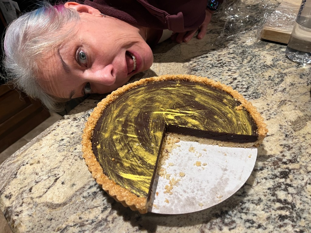 My awesome chef sister, Stacy, made me my absolute favorite dessert the night before I left Houston – a dark chocolate-cabernet sauvignon ganache tort in a walnut crust. She even added 14K gold dust to the top. We feasted on pizza & this decadent creation. The above photo shows what we left behind. Medicine for the soul. Thank you Stacy & Kaya & Scott for hosting me for so long & making sure I ate well.