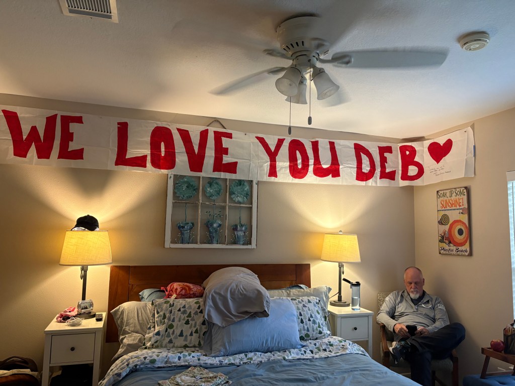 Steve flew home yesterday & is back under Peanut’s watchful eye. I’ll be taking tiny baby steps under Stacy’s watchful eye. Nobody expected this set-back, but here we are hopefully on the other side of it. I’ll continue to receive any prayers & meditations that you’ve got while I get over this part. I don’t think I’ll be taking that break & going back to the VI – I’m thinking it would be better to stay here where the medical options are hugely better than what we’ve got back home, just in case.